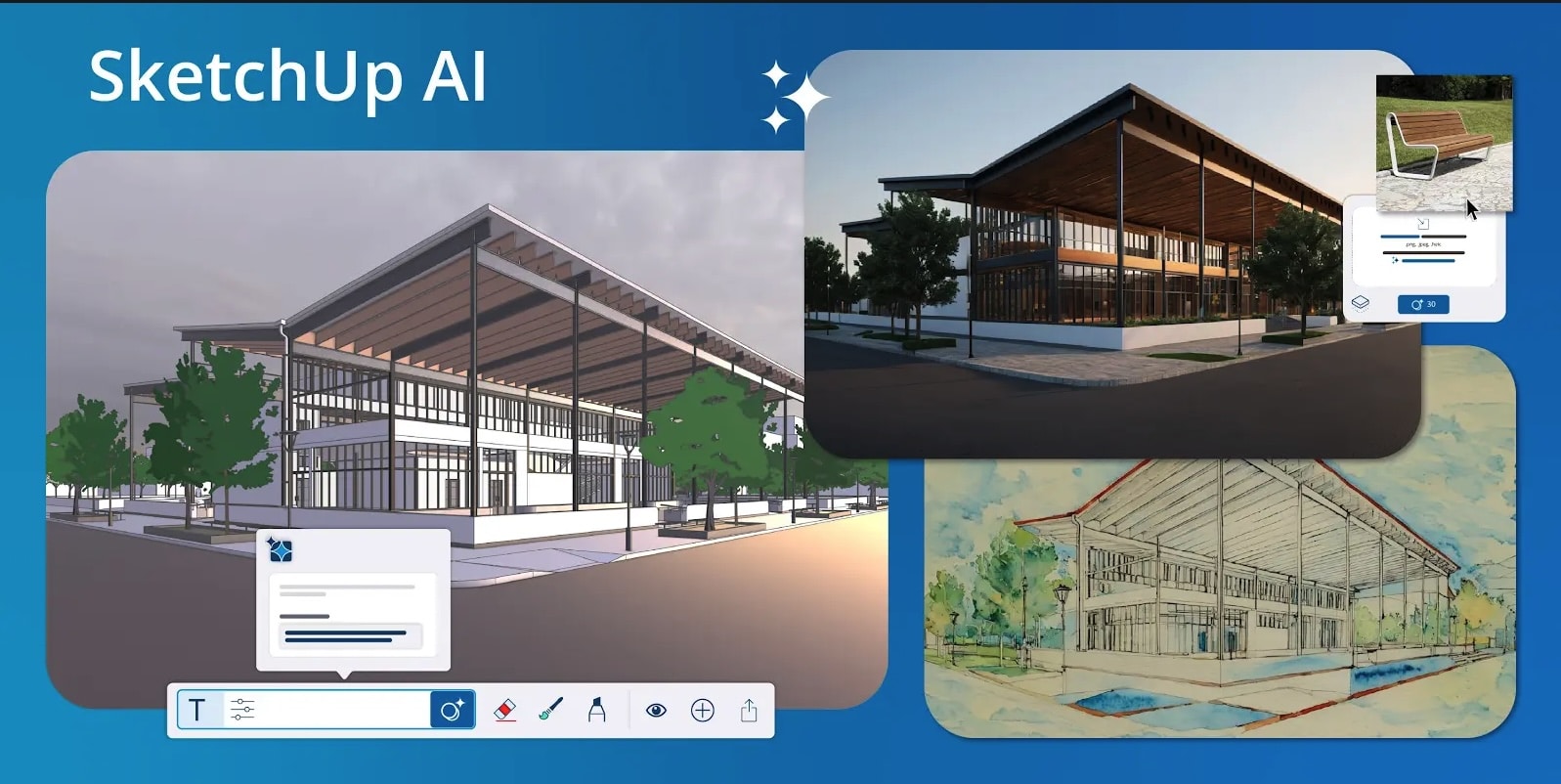 原本處於測試階段的 SketchUp Diffusion,現在正式更名並進化為 AI Render。這標誌著 SketchUp 的渲染思維已經從「物理光影計算」擴展到了「生成式創意」。